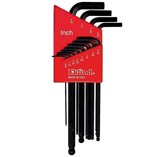 • 12 llaves en L punta de bola (pulgadas): .050, 1/16, 5/64, 3/32, 7/64, 1/8 , 9/64, 5/32, 3/16, 7/32, 1/4 , & 5/16