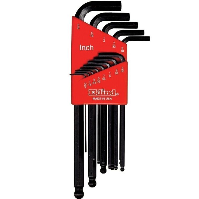 • 13 llaves en L punta de bola (pulgadas): .050, 1/16, 5/64, 3/32, 7/64, 1/8 , 9/64, 5/32, 3/16, 7/32, 1/4 , 5/16, & 3/8