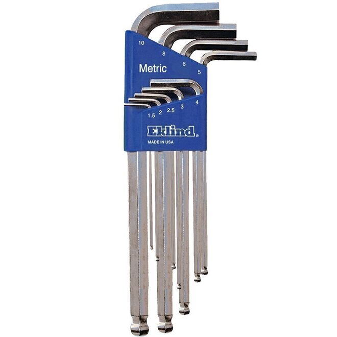 • 9 llaves en L punta de bola (métrico): 1.5, 2, 2.5, 3, 4, 5, 6, 8, & 10 mm