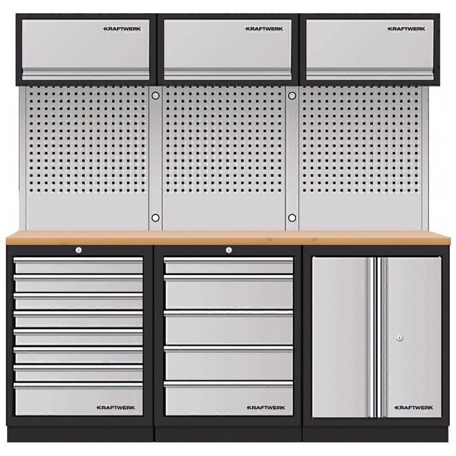 • Cajones con rodamientos de bolas en varios alturas, apto para todos los bandejas de herramientas KRAFTWERK (casquillos duros COMPLETO, EVA, EVA3) con cierre centralizado y bloqueable individualmente